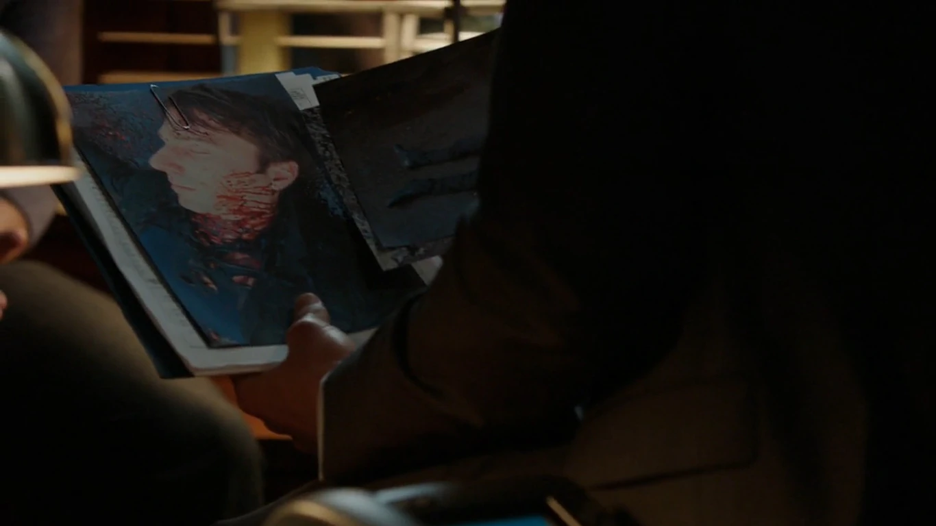 Before talking to Troyer, Hank asks Nick if he is going to play the Wesen card and Nick tells him only if he has to. Emily answers the door and takes the Detectives to her dad, who is on the phone. Troyer hangs up and asks if there is a problem. They ask questions about his relationship with Isaac, learning that he knew Isaac since he was a kid. Hank asks when the last time he saw Isaac was, but Emily joins in the conversation and says that Isaac came over last night to see her. Hank asks what her relationship with him was and she tells him he was a friend. The Detectives ask if either of them knew Frankie or if they know if Isaac knew Frankie, but they reply that they don't know who Frankie is. Nick and Hank ask a few more questions and then leave. Nick gets a call from Wu, who tells him that the M.E. found that Isaac had a golden feather, but neither the M.E. nor he know what it could mean.