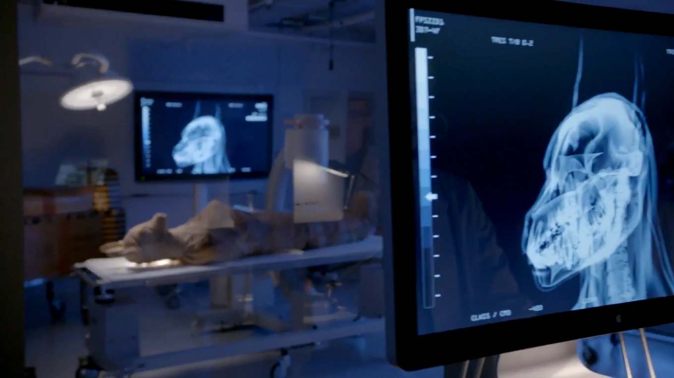 At the scene, Franco gives them info about one cop dying and the other being in the hospital. Franco says the officer in the hospital said the sarcophagus lid was open, although it is closed now. While Nick and Hank are examining the scene, Professor Gates arrives. Nick says to let her in, and she has them help her open the sarcophagus to check the mummy for any damage, which there is none. Nick comments on the mummy being strangely shaped, and Professor Gates says there could be many reasons why, but she hasn't started examining it yet. Hank asks if she knows what the symbols on the wall mean, and she tells him they say, "I protect the dead," which is part of an inscription found in Tutankhamun's tomb. She says that some people think of it as a curse, before leaving the lab so Nick and Hank can finish investigating.