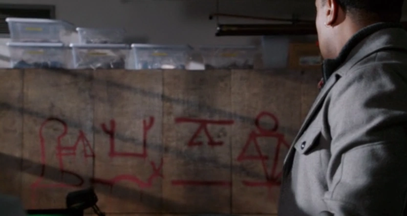 - The hieroglyph graffiti left at the university is actually very well done - it reads, from left to right, "khu=i sb-n ka=f", which is Middle Egyptian language meaning "I protect him whose soul has traveled." Later on, the film spool is marked with the word "Anubis" in hieroglyphs.