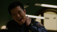Nick, Hank, and Wu do background checks on Benjamin and Joan. They find that they both have been arrested, but not recently. Wu suddenly grabs the back of his neck in pain and tells Nick and Hank that it was just a muscle strain or something, but he'll be fine.
