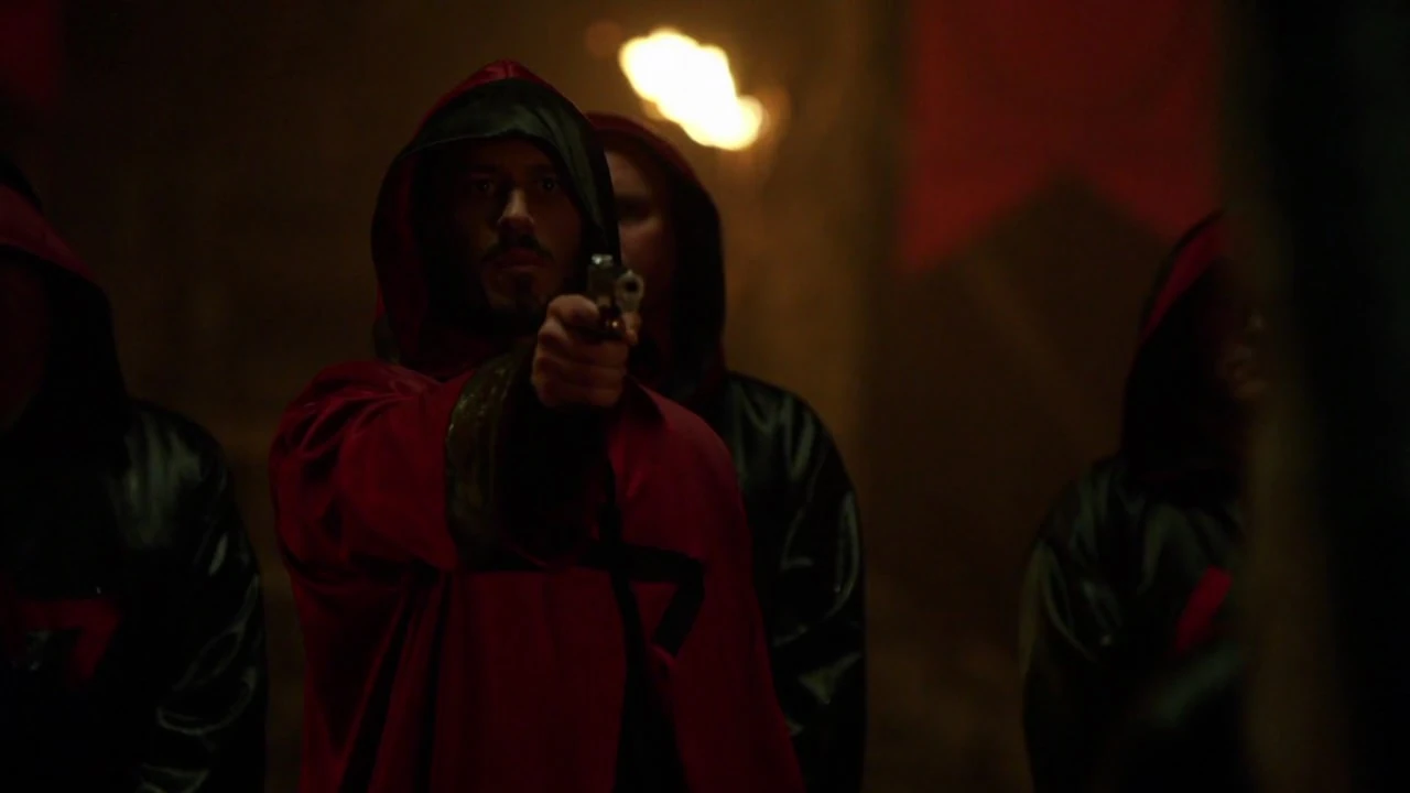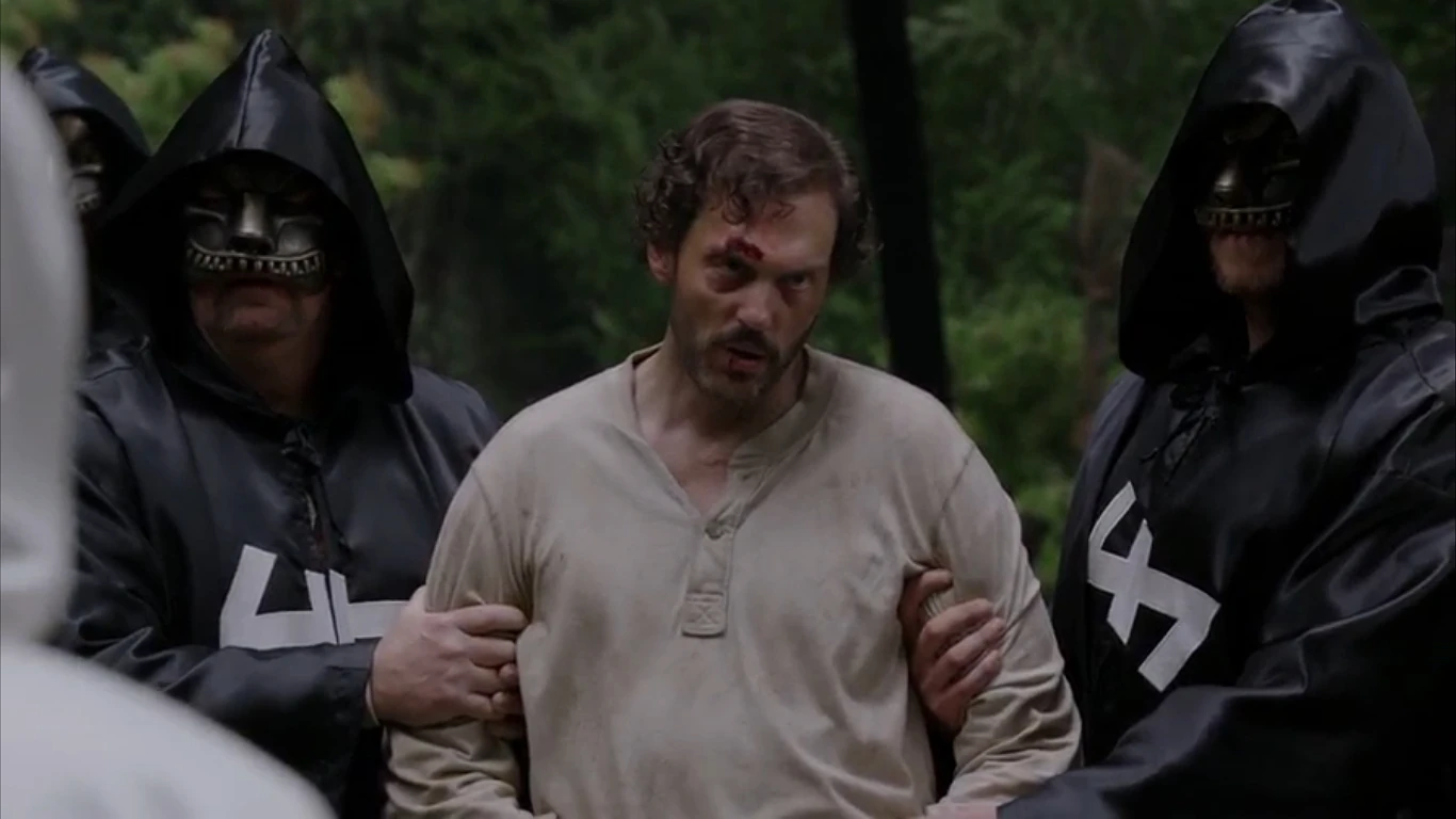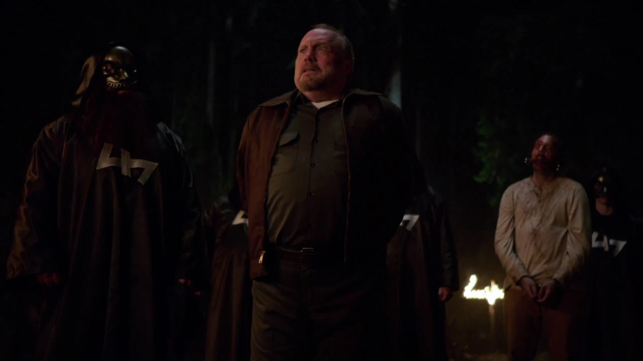 At the tribunal, Monroe continues his speech and talks about how they care about the purity of blood, but nothing in life is pure. He starts tearing up and says he loves his wife, and he always will. That's what real purity is. Riken says they will now take the vote and that the removal of the mask is a sentence of guilt. He takes his mask off, and everyone else follows. Riken stands up and says it's unanimous, and by Wesenrein law, Monroe will be put to death. Monroe is grabbed by the arms to take him to the stake, and he yells, "I will see you all in hell!" Bud says they can't do this, and the bag is put back over his head.
